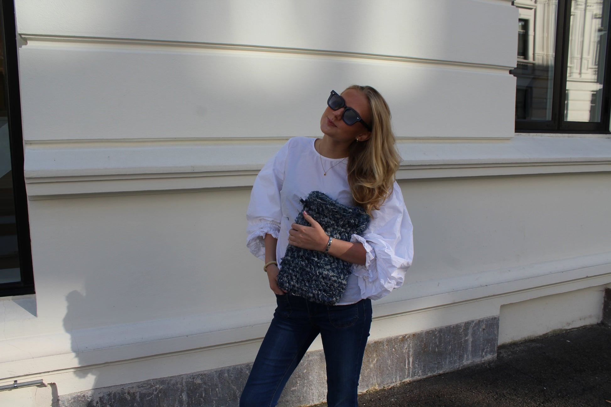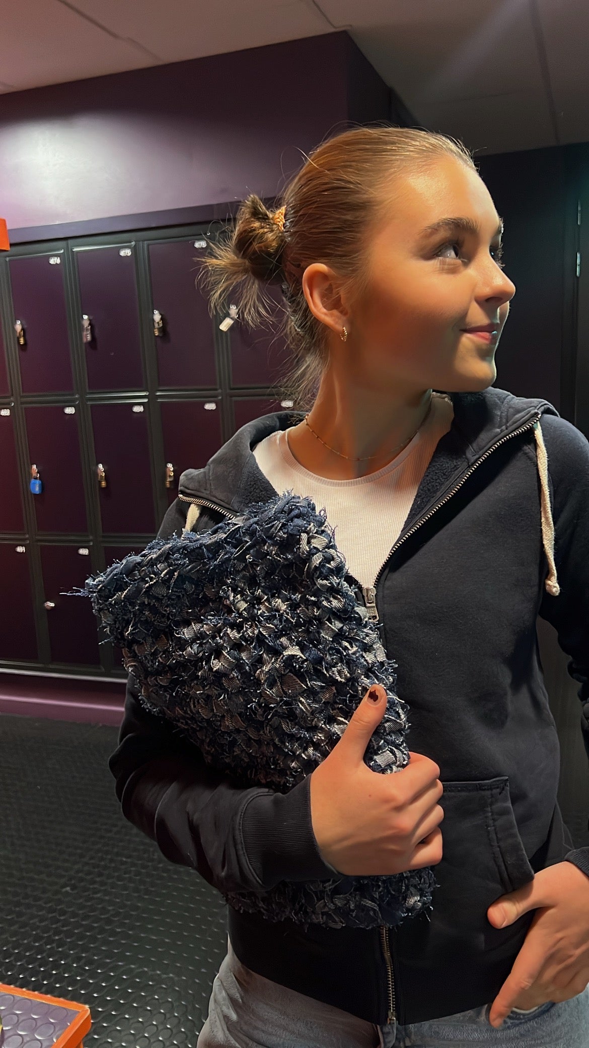 The DENIM cover– made from jeans that we ripped up to yarn. It cover up so well and look fabolus.